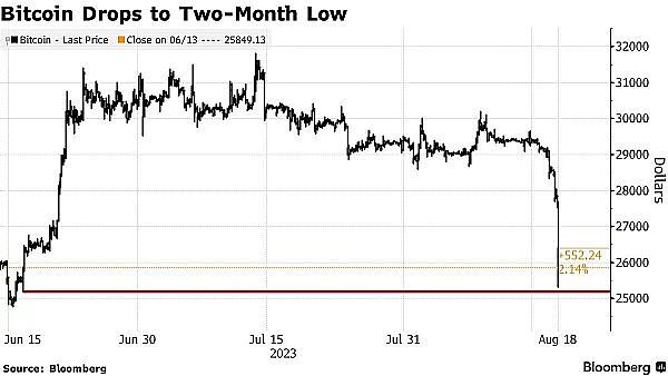 这是比特币价格两个月来首次跌破2.6万美元,随着全球政府债券收益率攀升至约15年来的最高水平,避险情绪笼罩着加密货币市场。
