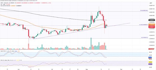 柴犬币价格交易接近 2023 年初长期修正的 23.60% 斐波那契水平。目前,Meme 币交易价格为 0.00000838 美元,盘中下跌 2.33%