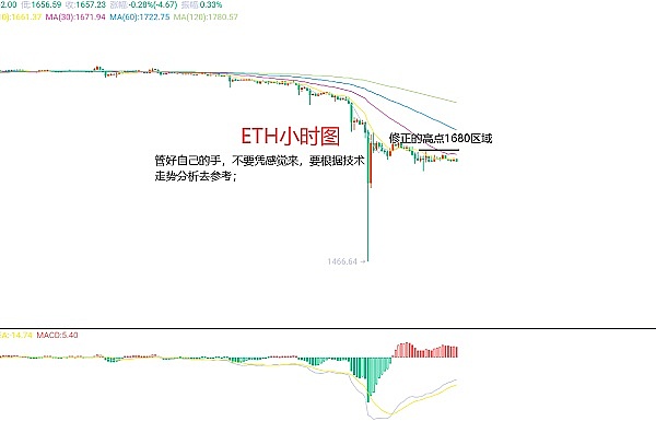 8月19日以太坊(ETH)合约技术面分析:今日方面,大周期日线级别昨日报收中阴线,K线形态上连阴下跌,价格运行于均线下方,附图指标死叉向下且价格有效破位前期低点位置,而反弹修正还没有力度,所以多不要碰;另外注意的也是一样一方面关注延续下跌,另一方面关注反弹修正或者时间换空间的横盘整理;短周期小时图凌晨修正高点在1680区域,当前价格没什么波动,整体趋势还是下跌优势,操作还是要等;不怕时间长,只怕做错没办法,所以管好自己的手。