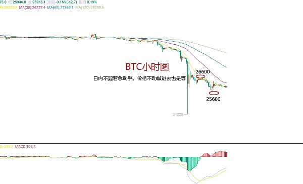 周末,其实没有太多需要讲的,周四价格大跌后肯定是要维持震荡修正的,而时间又刚好在周末;但是周线级别的走势和形态我们还是要去看看和分析下的。周线级别报收中阴,K线形态上连阴单阳价格运行于均线下方,附图指标死叉向下,且价格突破了前期的低点位置;所以大趋势上还是下跌优势。昨日操作我们现价给出BTC26500区域空和ETH1682区域空,分别止盈26000区域和1660区域,两天下来严格跟上策略执行的朋友,账户资金最少增加80%收获非常不错。