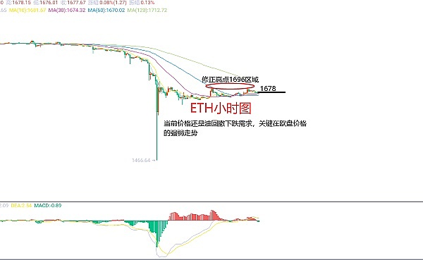 8月21日以太坊(ETH)合约技术面分析:今日方面,大周期日线级别昨日报收小阳线,K线形态上还是连阴单阳,价格运行于均线下方,附图指标死叉向下,整体趋势走势还是下跌明显优势的,而本周我们需要注意的就是价格的向下回补出现新低的概率比较小;短周期小时图周末价格修正高点在1696区域附近,低点在1638区域,当前价格承压回撤,K线形态连阴,附图指标死叉向下,日内还是要跌,欧盘能否破位是关键,因此今日ETH短线合约交易策略:现价1678区域直接空,止损放在1701区域,目标看1630-1615区域