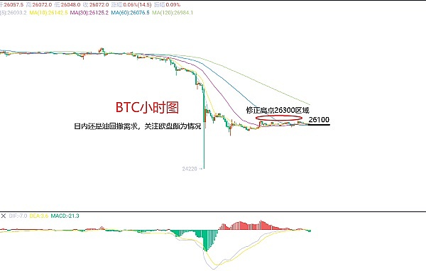 8月21日比特币(BTC)合约技术面分析:今日方面,大周期日线级别昨日报收小阳线,K线形态上还是连阴单阳,价格运行于均线下方,附图指标死叉向下放量运行,而整体走势也是在我们预期当中,周末的反弹就是修正价格回归均线的一种表现,而不是触底;短周期小时图周末没有太大的波动,修正的高点阻力位置在26300区域,低点在25600区域,当前K线形态连阴,附图指标死叉向下,那么今日我们还是要看延续下跌且欧盘破低是关键,因此今日BTC短线合约交易策略:现价26100区域直接空,止损26300区域,目标看25600-25500区域;