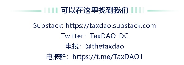 本公众号所发布的资讯或文章仅为交流讨论或一般参考目的,不应将本公众号任何内容视为法规、税务、会计、投资或其他专业咨询建议,也不代表对任何服务或产品的推介或要约。本公众号对资料的准确性、完整性或可靠性不作任何明示或暗示的陈述或保证。本公众号对发布的任何内容的变更不会另行通知,本公众号也没有义务更新已发布的任何内容。任何依据本公众号的全部或部分内容而作出的判断或决定(无论作为或不作为)以及因此造成的法律后果,TaxDAO 不承担任何责任。未经 TaxDAO 事先书面同意,不得为任何其它目的使用本公众号中的任何内容。转载请获得授权并注明作者和出处“TaxDAO”。