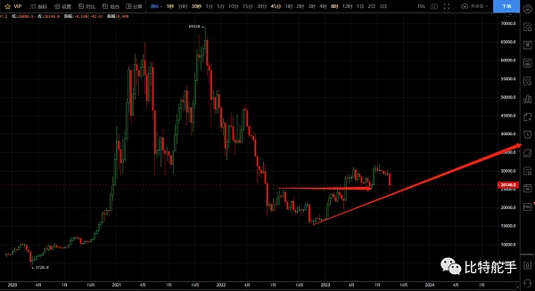 如图周线,周线以长下影线的阴线实体报收。收盘报26188,周内最高价29697最低24098,全周累跌10.64%!虽然上周在连续2个月的横盘缓跌之后,迎来了加速的下跌,因流动性和整体大环境的影响,市场并未表现的过于强势,没有很快的延续前期走势,但是上涨的趋势仍然还在,趋势未有被破坏。