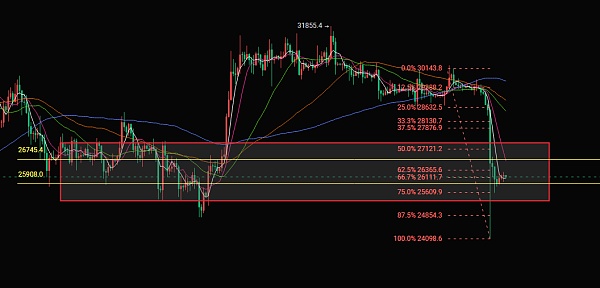 比特币五千点的跌幅,也经过三天市场修复,指标逐步的开始回归正常,偏离的情况有所改善,目前大级别处于震荡修复阶段,五日均线有所拐头向上,上方承压于26800一线,下方有25900的支撑,大概率会在这个区间在运行一段时间,直至指标回归正常位置