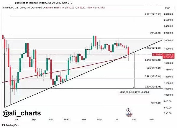 受欢迎的加密货币分析师 Ali Martinez写道:“ETH跌破 1,600 美元至 1,550 美元区间可能会为 37% 至 45% 的大幅调整奠定基础,目标为 1,000 美元”。