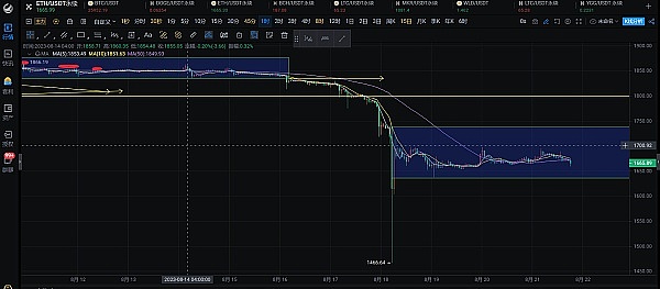 目前ETH的走势可以看到,前面被一根大阴线插针试探1466,一个小时跌了将近300点,在短时间内释放这么多空头能量出来,也是验证了前面横久必跌的一个理论,其实更大的可能是前面在1800上面横盘的太久,抄底看新高的人太多,这波打压也是为了清洗一下多军。
