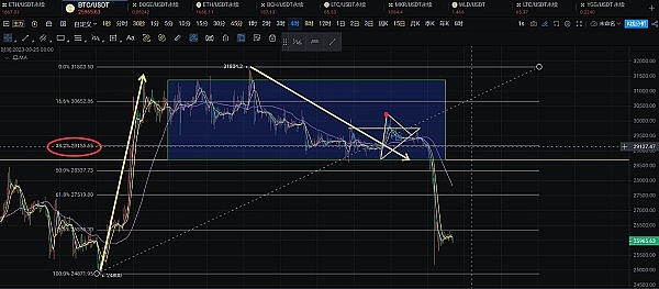 BTC这波回踩可以看到,把短期的涨势全部一下收复了,前面起涨点在24800 这波最低回踩25200 距离起点也就400点的差距,可以说是一下回到解放前。