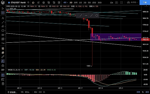 以太坊昨日高位触及1688一线后震荡下行,期间虽有反弹但未破前高,晚间低位跌至1649一线支撑反弹,恭喜跟上思路的朋友,目前币价在1662附近运行,四小时级别价格再次跌至箱体下沿支撑未破走出反弹,但力度不大,上方阻力明显,随后k线走出三连阴,多头逐步缩量,又再次试探箱体支撑的需求,若破位有机会跌至前低附近,周kmacd逐步放量,下方支撑破位,有延续下跌的需求,思路建议反弹高空为主低多为辅,上方压制1680-1700,下方支撑1650-1620
