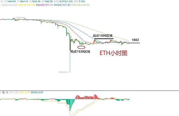 8月22日以太坊(ETH)合约技术面分析:今日方面,大周期日线级别昨日报收小阴线,K线形态上连阴下跌,附图指标死叉向下,在大趋势走势上下跌还是比较明显的,但前面讲过本周只是看回补的力度出现新低的概率不大,前期插针低点在1466区域,短时间再到不了这个位置;短周期小时图整体走势波动不大,目前价格还是处于反复洗盘震荡节奏当中,所以交易还是要短线,主要思路高空不变,但要根据信号去做,当前早间承压,K线形态连阴,日内还是又下跌需求;因此今日ETH短线合约交易策略:现价1663区域直接空,止损1685区域,目标看1630-1615区域;