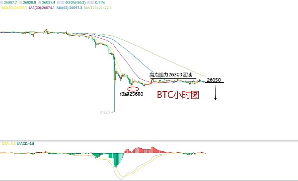 8月22日比特币(BTC)合约技术面分析:今日方面,大周期日线级别昨日报收小阴线,K线形态上连阴下跌虽说价格没有向下破位前期低点位置,但是目前是基本完成了修正的走势,附图指标死叉向下,价格运行于均线下方,所以需要等的就是再次向下爆发出现新低;短周期小时图前一日美盘价格承压回撤,凌晨反弹今日早间二次承压向下,高点阻力还是26300区域,低点支撑25600区域,当前K线形态连阴,附图指标死叉,那么日内还是要看新低的;因此今日BTC短线合约交易策略:现价26050区域直接空,止损26300区域,目标看25600-25500区域;