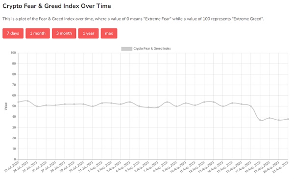 有点出乎意料的是,BTC 恐惧和贪婪指数在 8 月 18 日出现了“恐惧”,但在接下来的三天内无法回升至“中性”或“贪婪”,这代表了投资者的悲观情绪占主导地位。