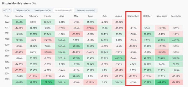 通过上面的图表可以很明显的发现,九月份对比特币来说历来是一个充满挑战的时期。 在某些情况下,加密货币的价格大幅下跌,跌幅高达 19%。这表明未来一个月比特币价格可能面临进一步下行压力。然而,值得注意的是,历史趋势也表明有可能出现更温和的下降。例如,2013 年 9 月份,比特币的价格仅下跌了 1%,与当月相关的更广泛的负面情绪背道而驰。