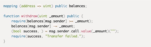 在下面的代码片段中,用户可以通过调用提款withdraw函数并指定他们要提取的金额来从他们的账户中提取资金。然而,由于withdraw函数没有防止对该函数的递归调用,因此很容易遭到重入攻击,