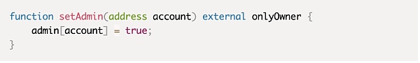 函数setAdmin()允许任何人将任何地址设置为合约管理员。根据合约内授予管理地址的权限,这有可能导致开发者失去对合约本身的控制甚至资金造成损失。