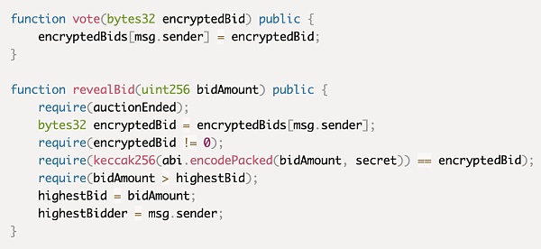 在竞价期结束时,用户可以通过提交原始竞价金额和一个秘密值来揭示他们的竞价。合约验证出价金额和保密的哈希值与存储的秘密出价相符,确保出价是在竞价期结束前提交的。如果该出价高于当前的最高出价,它就成为新的最高出价。通过在竞价期结束前掩盖出价金额,该功能可以缓释抢先交易攻击。