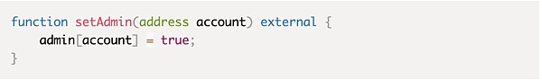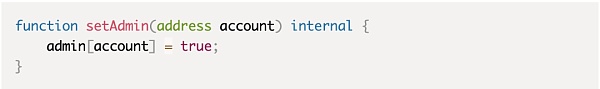 通过将函数的可见性设置为internal内部,某些合约函数在内部就可能允许将某些用户设置为管理员。