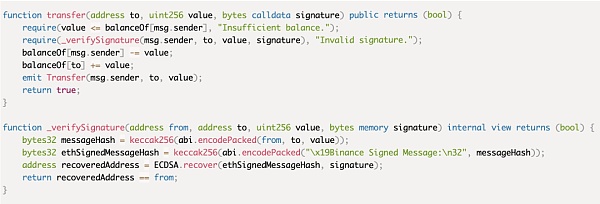 以下代码片段表示了BNB链上一个代币的转移transfer实现过程。该代码很容易受到重放攻击,从而使得攻击者能够重复使用同一个签名。