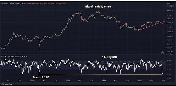 14 天 RSI 已跌至 2020 年 3 月以来的最低点。 (TradingView/ CoinDesk) (TradingView/ CoinDesk)