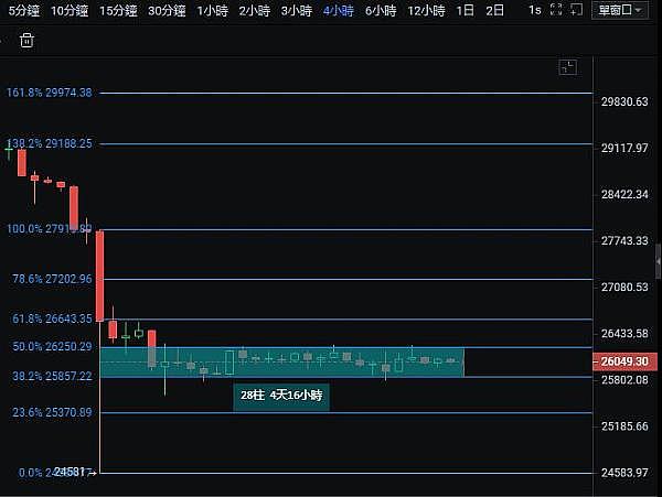②:4小时候目前一直维持布林带区间内的窄幅震荡,以25850到上方的26250区间,而这个区间,刚好也是斐波那契回调的38.2%到50.5%的区域内,短期也是在等这个区域,但是从均线方面看的话,5-10日均线粘合运行,但是上方有个60日均线没有调整到位,那后面就要防去上破摸60日均线,而60日均线所在区域27500附近,伴随着时间的推移,均线也会逐步走低,那么下移的话,就要防27200区域,这个区域也是日线级别的10日均线位置,日线的5日均线走平,那么也会逐步去等待10日均线到位,那后面就要等5-10日均线整体修复完毕。