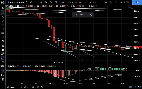 大饼昨日高位触及26220一线受阻,晚间加速下行跌至25360附近支撑反弹,恭喜跟上昨日思路的朋友空单获利600点,目前币价在26060附近运行,四小时级别行情二次下探未破前低,k线由阴转阳,但反弹未能延续,上方受趋势线压制没有效突破,整体再次回到区间内运行,macd多头运行双线金叉状态,日线级别上方压制明显,整体呈弱势结构,虽有反弹但多头没出现明显放量,思路保持不变反弹高空为主低多为辅,上方压制26300-26600,下方支撑25800-25500