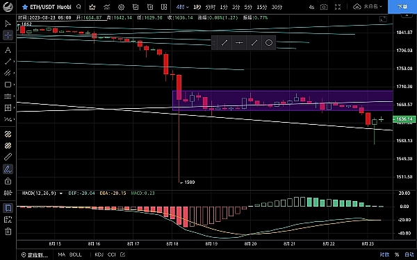 以太坊经过近今天的震荡修复昨晚终于向下破位,低位跌至1579一线支撑反弹,恭喜跟上昨日思路的朋友空单获利80点,目前币价在1635附近运行,四小时级别k线插针后收回趋势线上方,但多头没有延续,上方压制较强,macd多头转空双线走粘合,短期来看1650阻力未破震荡的概率较大,日线级别虽收针反弹但整体走势依旧偏弱,行情没有反转,后市仍有下跌的可能,思路建议反弹高空为主低多为辅,上方压制1650-1680,下方支撑1610-1580