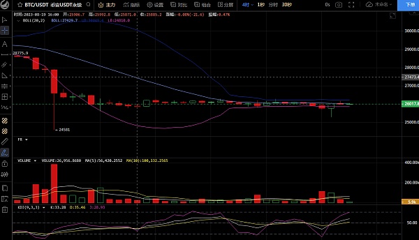 昨天盘面波动依旧不大,并没有给到我们相应的惊喜,仍旧是呈窄幅震荡走势,晚间空头放量,一路震荡下行,凌晨向下插针最低至25300附近,随后行情快速反弹至2600附近,目前行情于26000附近震荡运行。