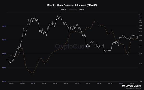 过去几个月,比特币的价格几乎没有上涨的意图,因为它一直在 3 万美元的水平下方盘整。该分析旨在评估近期的价格走势是否影响了矿工的行为。下图描述了矿工储备指标,并应用了 30 天标准移动平均线以实现更好的可视化。矿工储备指标衡量矿工钱包中持有的 BTC 数量。很明显,在过去的几个月里,矿商在某种程度上停止了抛售。他们一直在以惊人的速度积累比特币。这一趋势表明,矿商(可以说是比特币网络中最重要的群体)对未来的价格走势持乐观态度,并且没有压力出售其代币来支付运营费用。从长远来看,由此导致的供应减少可能对市场有利,因为如果需求充足,新的牛市可能即将到来。