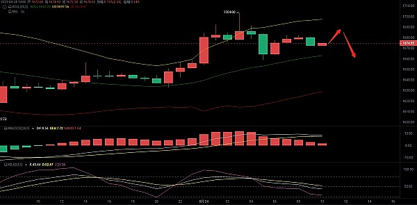 晚间K线一路上行攻破1700未能企稳,回落至1680附近运行。