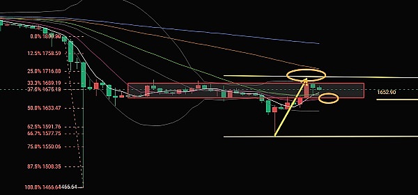 以太坊和大饼一模一样,也不亏是亲兄弟,唯一的差距就是空间上有所不同,脾气不一样,技术面大差不差,现在的价格也是再次回到之前的震荡区间,价格随着五日均线的向上,呈现到烘托作用,不破继续上行,无非就是需要点时间罢了,暂时大区间来看,上方承压于1715,下方支撑1580,能否走出一个大箱体结构,还需要通过时间来验证