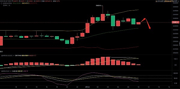 1小时图来看,BOLL布林通道上轨呈下行趋势,MACD粘合下行,KDJ三线向下发散,4小时图来看,K线突破上轨受到压制回落至中轨上方运行,附图多头能量开始缩量,KDJ三线向下形成死叉。东哥建议短期空单进场。