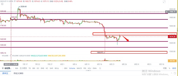 复盘:多空主力在颈线附近1630到1650一线反复的测试,晚间也是再次引来来小幅度的上涨至1700一线,随后回落至1657后再次走出反弹目前位于1675一线震荡运行,昨日晚间空单在手的朋友可以继续持有下看,日内还是以高空为主,虽这波走出了一个较为可观的空间但整体局势还是偏弱,不要追涨杀跌保持清晰的思路,但是量能上也并没有出现较为明显的增量资金变化,所以操作上我们还是需要关注底部的修复是否能够夯实,下方底部修复时间越久,后期突破的上涨空间就会越大,反之如果价格上涨,量能跟不上,后期还是极有可能出现虚涨再次面临二次抛压情绪。四小时小周期级别中可看出,币价摸高与前高持平后压力也随之而来,多头量能柱虚实交替排列十分不稳定,技术面四小时图来看,布林带走向依旧处于平缓阶段,价格来到了中轨上方,1700没有实际的企稳那么就还处于震荡区间内,附图指标kd来看三线有拐头向下的迹象,所以我们日内思路依旧是以看空为主。