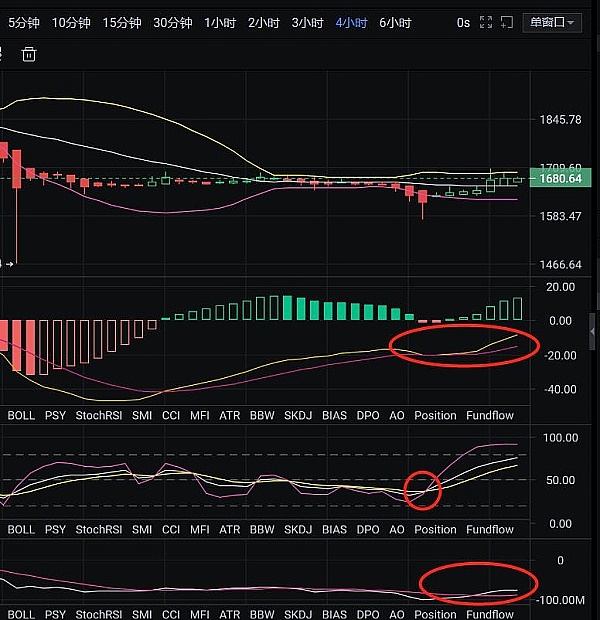 KDJ三线下穿交点并没有因为价格跳水而走出相应的低位,这里就KDJ指标来言是存在底背离现象的。如果真实存在后续得到验证那么短期价格由空转多的可能就会加大。能否重回高点,短期强阻力位1770一线突破情况值得关注