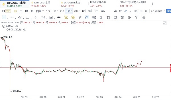小时线大饼在26400持续震荡相当长时间,价格没有出现大幅下跌,这波上涨是从25280启动,和昨日的高点有1500点的上升空间,均线上看,多头趋势非常明显,短期趋势难以改变,那么晚间大概率还会拉升到一定空间去试探上方压力点,预计位置在MA240均线压制位27100附近,向上插针的话,可以到达27500附近。以太行情下午有下探动作,但是在1665附近止跌,趋势并没有破位,趋势还是多头往上。小时线KDJ呈现金叉形态,MACD下跌动能减弱。