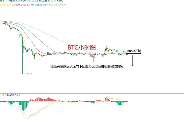 8月25日比特币(BTC)合约技术面分析:今日方面,大周期日线级别昨日报收小阴线,K线形态上连阴单阳,价格运行于低位,附图指标死叉相差,前期的价格修正目前基本走完,横盘震荡后大概率伴随二次下跌,时间也来到了金九银十的全年最佳时间,所以大家把握好。短周期小时图昨日价格回撤但没有向下破位,凌晨修正后目前延续向下,K线形态连阴,附图指标多头缩量,快慢线有粘合死叉迹象,那么日内大概率是有回撤需求的,因此今日BTC短线合约交易策略:现价26050直接空,止损26250区域,目标看25700-25600区域;