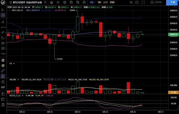 昨日行情盘面依旧一直维持在小幅区间内震荡运行,一样在凌晨开始持续走低走出一波行情,盘面来看晚间开始于中轨附近一路下探后,刺破下轨,最低来到25700附近,而后开始反弹修复,目前行情于26000附近区间震荡修复。