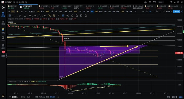 以太坊行情分析:昨天白盘行情处于震荡修复区间,大家都在等待晚间鲍威尔的讲话,但是老鲍并未给出具体的应对方案,为后续行情的走势埋下了不确定性,而昨天长路有提示,只要不跌破下方的上涨趋势线,都可以做多。昨天晚间波动加快,但并未走出三角运行区间再次回到了1655附近震荡运行,今天是周六,那么行情大概率又将走窄幅震荡,日线方面,随着行情的不断回踩测试,MACD红色量柱仍处于缩量的状态,有可能走出底背离的模型,大家操作上多注意。
