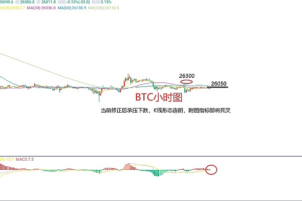 8月26日比特币(BTC)合约技术面分析:今日方面,大周期日线级别昨日报收小阴线,K线形态上连阴下跌,价格运行于低位,附图指标死叉向下,大趋势走势还是空非常明显的;且注意每一次的反弹后都会向下回撤,而价格基本维持不动,这是典型的反复洗盘节奏;而高点阻力位置在26800区域附近,低点24200区域;短周期小时图昨日价格美盘冲高回落,价格破了前一日低点但是没有延续,凌晨修正后当前承压延续下跌,K线形态连阴,附图指标有死叉迹象;因此今日BTC短线合约交易策略:现价26050区域直接空,止损26300区域,目标看25600-25500区域;