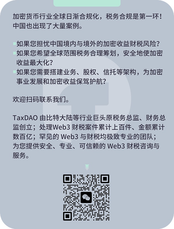 关于我们:TaxDAO 由多位来自加密货币领域的税务、财务高级管理人员创立,团队对加密资产的税务合规和规划具有丰富经验,经手管理较大规模加密资产。团队立足中国,也具有丰富的国际化经验,对于在全球背景下如何进行税务合规、配置资产,有独到的见解。欢迎关注我们的公众号,我们会持续推出原创与编译的加密税务、财务专业文章。如有咨询或希望加入 TaxDAO,欢迎联系我们小助手。