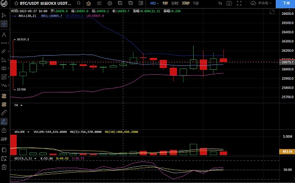 四小时盘面来看,k线在突破boll上轨后承压迅速回落,反弹力度偏弱,多头能量无力继续上行。上方压力依然较强。但kdj三线金叉向上,macd多头能量柱有小幅放量趋势。证明日内还是会有小幅反弹,但是反弹应该不会太大。整体来看,市场在一个区间内来回波动,没有明显的单边行情信号。指标MACD显示一条直线。针对这种市场结构,日内我们还是以25800支撑26300压力短线来回进行操作。