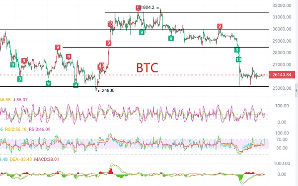 以太现在是在下方MA5与MA10来回进行震荡进行突破,而目前的附图指标也是处于低位向上放量的阶段,对于目前的大饼行情走势而言,还是处于向上放量的状态之中,所以说对于后续的行情,依旧是可以继续等待箱体进行突破,而下方的支撑目前依旧是在25600-25800这个区间,行情在下方压力位仍可以布局空。