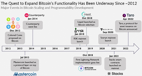 资产的发行和流转之前一直是以太坊的叙事,但现在同样也成为了比特币的叙事。早在2014年以太坊出现时,比特币就已经开始探索发行资产的业务需求。比如最知名的Omni Layer协议发行的最早的稳定币USDT。当时,世界第一大加密稳定币发行在比特币网络的UTXO的OpReturn上,然而由于那时的OpReturn 只支持80字节的内容空间,导致OmniLayer协议的失败。于是比特币网络在后面不断地进行了技术升级,包括我们提到的segwi升级和Taproot 升级,也正是因为这两次技术升级,为比特币后续生态的发展提供了可能。