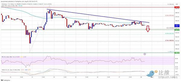 此外,ETH/USD小时图上有一条关键的看跌趋势线正在形成,阻力位在1660美元附近。如果价格保持在 1,640 美元支撑位上方,多头可能会尝试新一轮上涨。