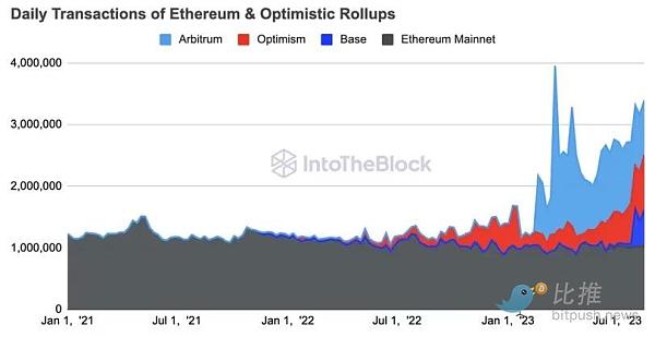 根据分析公司 IntoTheBlock 跟踪的数据,8 月 15 日, Optimism 主网上的每日交易数量创下近 90 万笔交易的历史新高。此外,以太坊主网和使用 Optimistic Rollup 技术的主要 Layer 2 之间处理的交易数量在本月初创下了历史第二高值。