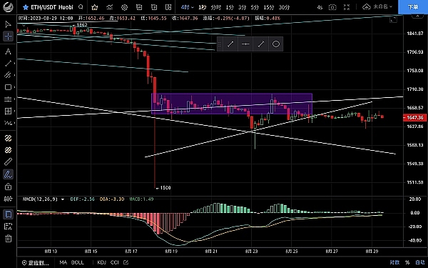 以太坊近期走势没什么太大变化,昨日低位跌至1623一线后迅速反弹,高位触及1663一线受阻回落,目前币价在1646附近运行,四小时级别行情跌破前期箱体后形成顶底转换,后面多次触及上方压制都未能有效突破,可见整体走势偏弱,但空头没有明显量能,macd双线粘合震荡,预计短期破位的可能性不大,日线级别来看空头逐步缩量双线聚拢有形成金叉的可能,短期行情震荡修复时间较久,预计会走一波反弹,但空间不会太大,趋势还是空头,反弹就是机会,短线的话高空低多对待,上方压制1670-1700,下方支撑1620-1600