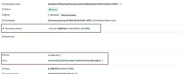 最引人注目的是一笔涉及3,000 ETH(价值约495万美元)的交易。这些ETH从他著名的Vitalik.eth钱包发送到另一个名为Vb2的钱包,使得后者的余额达到3,017 ETH,价值略高于495万美元。