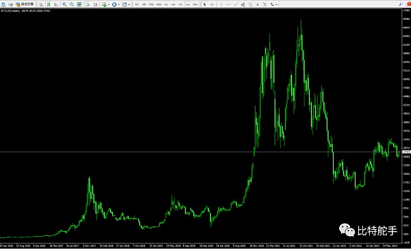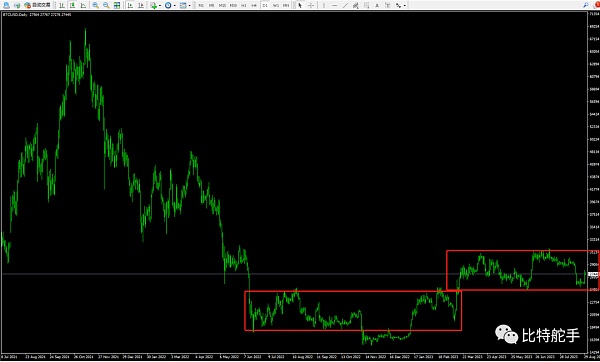 上图为比特币日线,价格就是这样,市场就是这样,从一个横盘区间到达另外一个横盘区间。熊市大概就是这样的节奏吧。