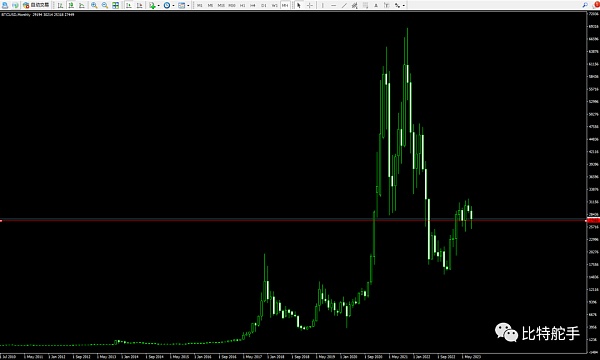 上图为比特币月线,图中有一根红色线,为了让大家更通俗易懂的看清楚价格走势,我特地标记的!