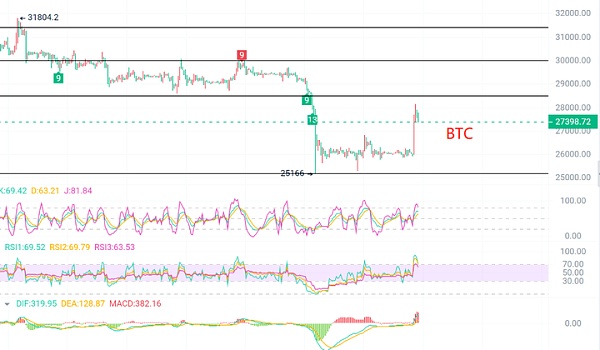虽然昨晚的消息面引发了一根大阳线出现,但是不要太乐观。周线下跌趋势才开启,开启下跌初期的时候多头反抗是正常的,但是反弹是反弹,不要因为看到上涨就幻想还要涨很多。日线的反弹最终只是为了诱多,套更多的人。如上图行情要反转首先要突破下降趋势线,目前还没有摸到。如果价格趋势上涨,空头清算可能会将加密货币推回到之前的区间。然而,如果发生相反的情况,大量多头头寸可能会将比特币推向关键支撑位。个人还是看好空头趋势27500附近可以考虑空单进场。