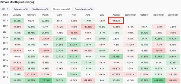 BTC 最近的下行价格走势将 RSI 推至历史超卖水平 28。下图显示,几乎每年 8 月 RSI 为负且 BTC 月回报率超过 10%,导致 9 月横盘整理,但 10 月呈绿色。如果比特币的价格与其历史走势一致,那么性能和 RSI 的下降可能预示着加密货币在未来两个月内将大幅上涨。Glassnode 联合创始人表示:过去的趋势表明,这种走势通常表明价格有可能上涨。这意味着,随着卖家努力应对进一步下跌,近期可能会出现逆转。